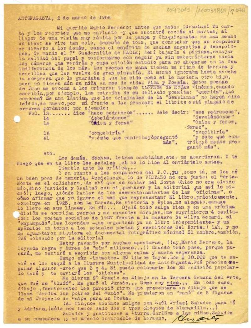 Antofagasta, Chile [a] Mario Ferrero Carta, 1956 marzo 2, [manuscrito] Andrés Sabella.