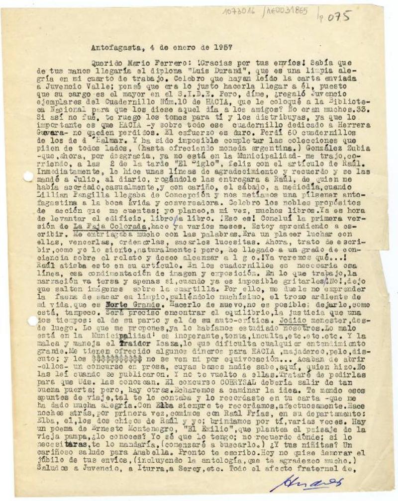 Antofagasta, Chile [a] Mario Ferrero Carta, 1957 enero 4, [manuscrito] Andrés Sabella.