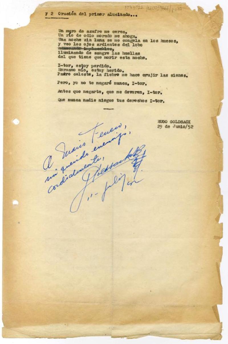 Oración del primer alucinado [manuscrito] Hugo Goldsack.