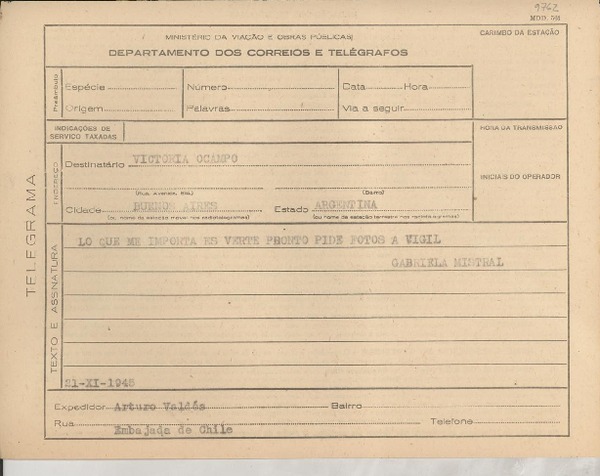 [Telegrama] 1945 nov. 21, [Brasil] [a] Victoria Ocampo, Buenos Aires, Argentina [manuscrito] Gabriela Mistral.