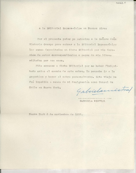 [Carta] 1955 nov. 5, Nueva York, [EE.UU.] [a la] Editorial Losada, Buenos Aires, [Argentina] [manuscrito] Gabriela Mistral.
