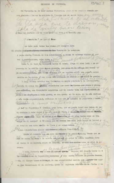 Recuerdos de Victoria [manuscrito] Gabriela Mistral.