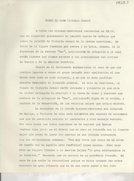 Sobre el caso Victoria Ocampo [manuscrito] Gabriela Mistral.