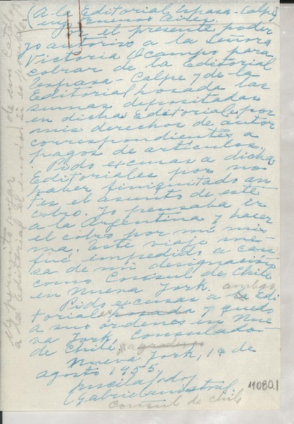 [Carta] 1955 ago. 14, Nueva York, [EE.UU.] [a la] Editorial Espasa-Calpe, Buenos Aires, [Argentina] [manuscrito] Gabriela Mistral.