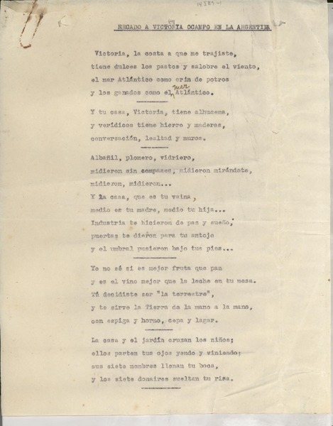 Recado a Victoria Ocampo en la Argentina [manuscrito] Gabriela Mistral.