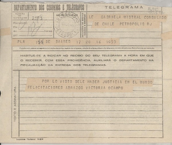 [Telegrama] 1945 nov. 16, BAires, [Argentina] [a] Gabriela Mistral, Consulado de Chile, Petrópolis, RJ, [Brasil] [manuscrito] Victoria Ocampo.