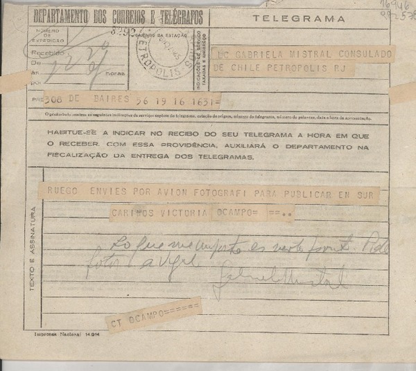 [Telegrama] 1944 abr. 8, Buenos Aires [a] Gabriela Mistral, Petrópolis [manuscrito] Victoria Ocampo.