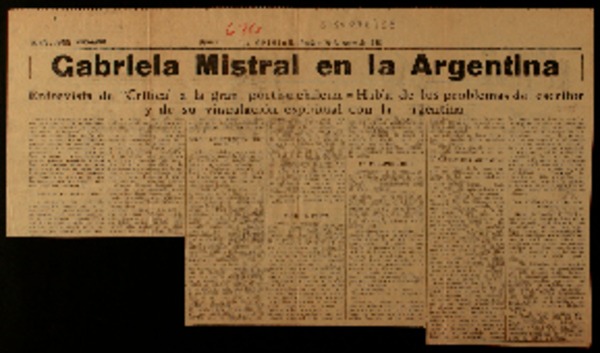 Gabriela Mistral en la Argentina entrevista de "Crítica" a la gran poetisa chilena : habla de los problemas del escritor y de su vinculación espiritual con la Argentina. [artículo] :