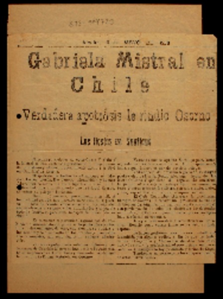 Gabriela Mistral en Chile verdadera apoteosis le rindió Osorno : las fiestas en Santiago. [artículo] :
