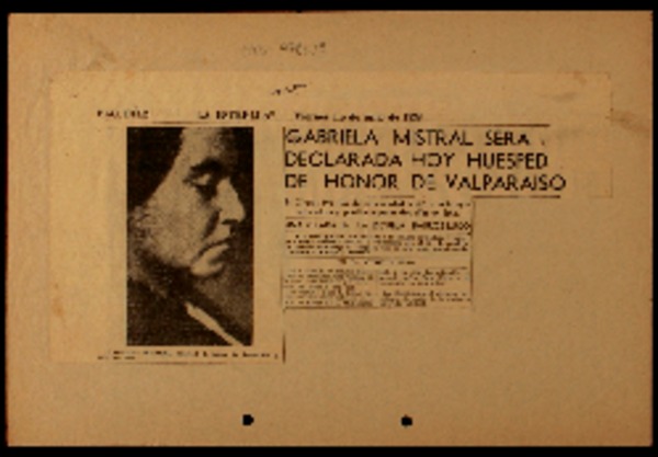 Gabriela Mistral será declarada hoy huesped de honor de Valparaíso el círculo Pro Paz de ésta ciudad invitó a la insigne educadora y poetisa a pasar los días en ésta : una velada en la Escuela Barros Luco. [artículo] :