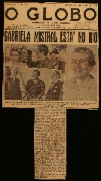 A mais alta poetisa dã America no Rio Gabriella Mistral chegou hoje á nossa capital, onde permanecerá durante alguns mezes[artículo] :