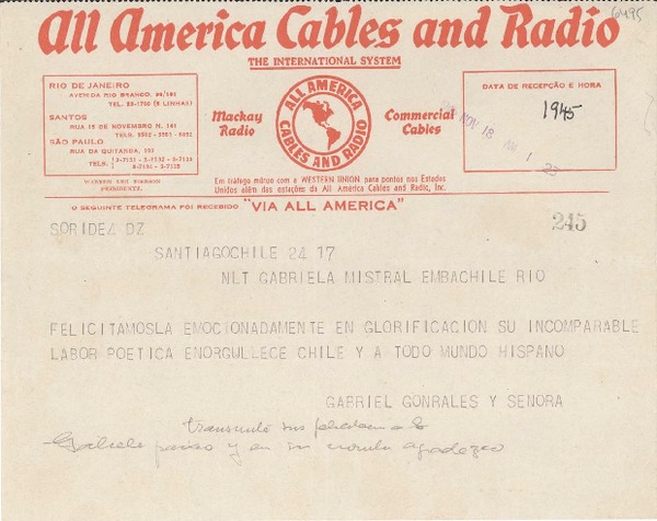 [Telegrama] 1945 nov. 18, Santiago, Chile [a] Gabriela Mistral, Rio de Janeiro, [Brasil] [manuscrito] Gabriel Gonrález [sic] [Videla] y Señora.