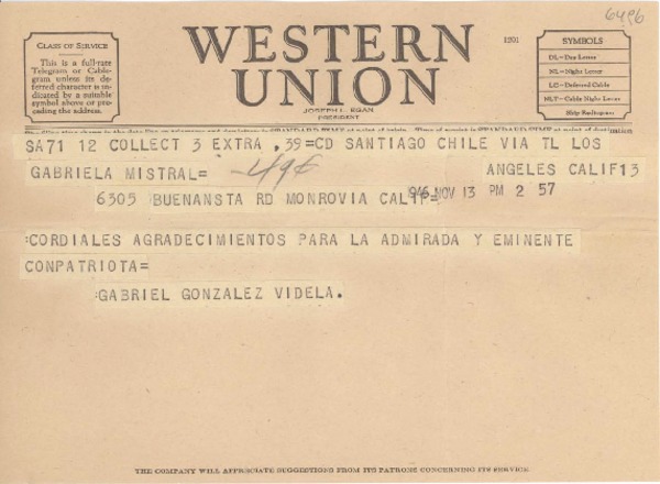 [Telegrama] 1946 nov. 13, Santiago, Chile [a] Gabriela Mistral, Los Angeles, Calif., [EE.UU.] [manuscrito] Gabriel González Videla.