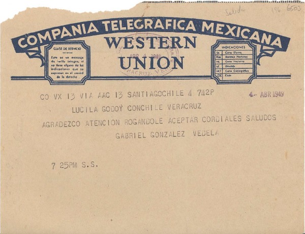 [Telegrama] 1949 abr. 4, Santiago, Chile [a] Lucila Godoy, Veracruz, [México] [manuscrito] Gabriel González Videla.