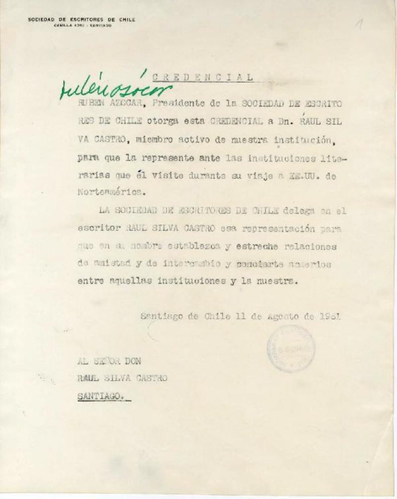 [Credencial] 1961 agosto 11, Santiago, Chile [emitida a] Raúl Silva Castro [manuscrito] Sociedad de Escritores de Chile.