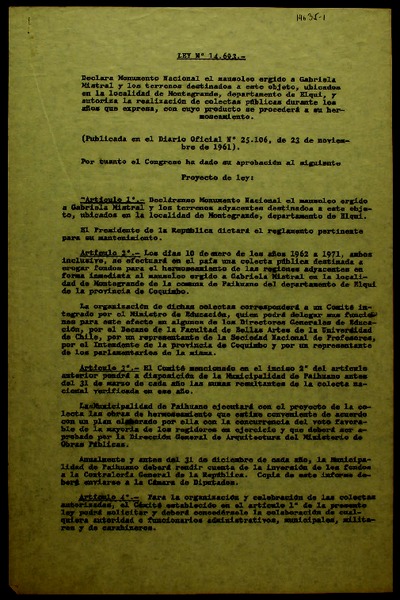Ley no. 14.693 [manuscrito] Jorge Alessandri Rodríguez.