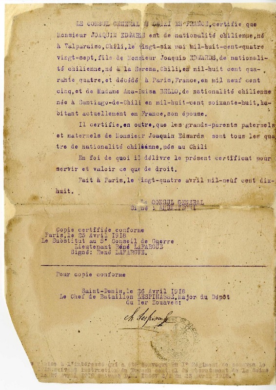 [Certificado] 1918 abr. 25, París, Francia [a] Joaquín Edwards Bello [manuscrito] Consulado de Chile (Francia).