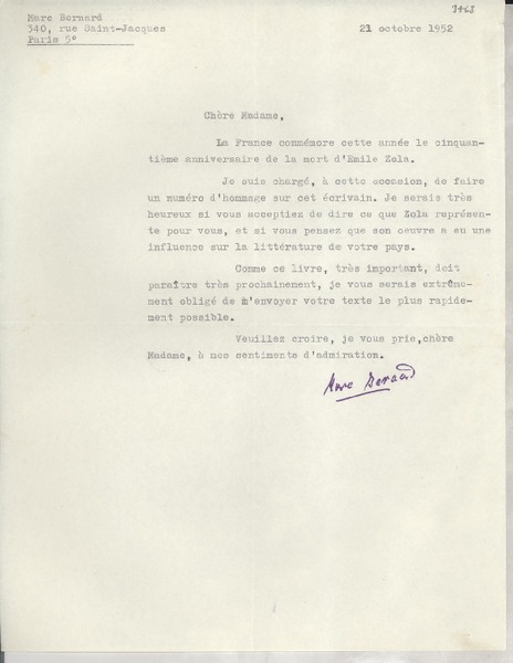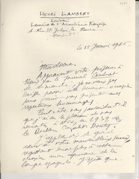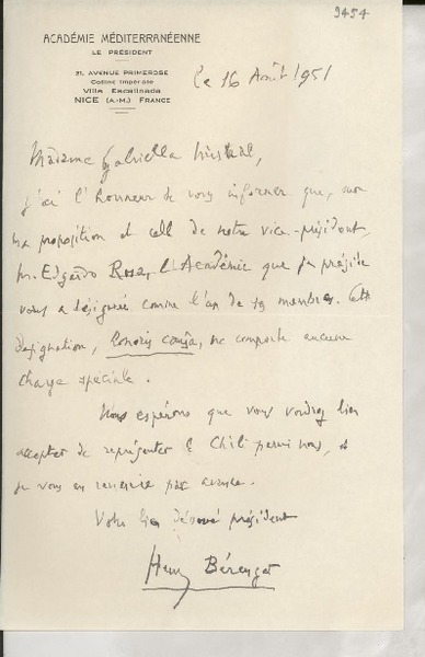 [Carta] 1945 nov. 20, Paris, [Francia] [a] Gabriela Mistral, Rio de Janeiro, [Brasil] [manuscrito] Henri Membré.