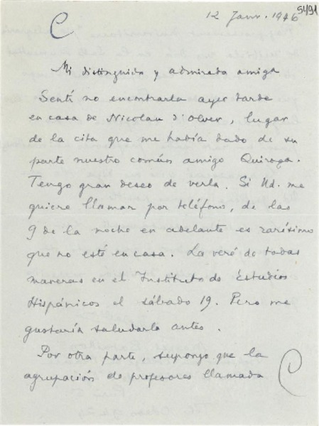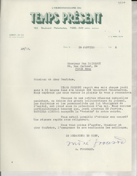 [Carta] 1946 ene. 12, Paris [a] Gabriela Mistral [manuscrito] Marcel Bataillon.
