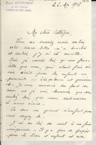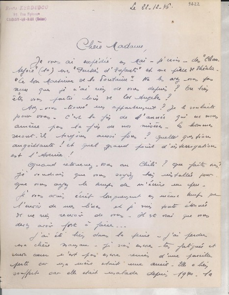 [Carta] 1946 déc. 22, Choisy-Le-Roi, [Francia] [a] Gabriela Mistral [manuscrito] Renée Kerdudou.