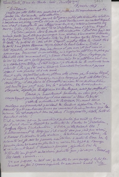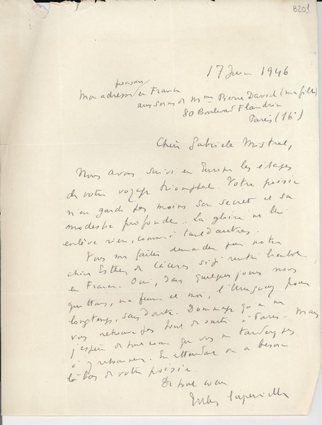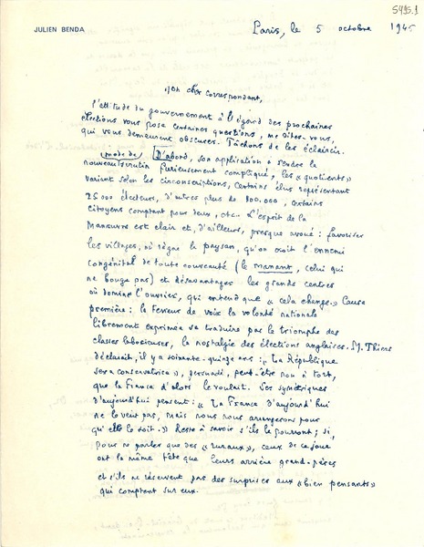 [Carta] 1945 oct. 5, Paris [a] Gabriela Mistral [manuscrito] Julien Benda.