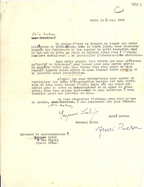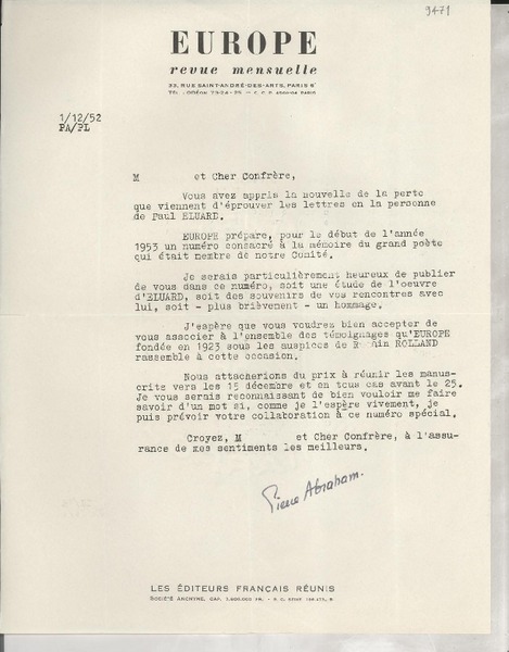 Paris, Francia [a] Salvador Reyes Cartas, desde enero a mayo de 1947, [manuscrito] Francis de Miomandre.