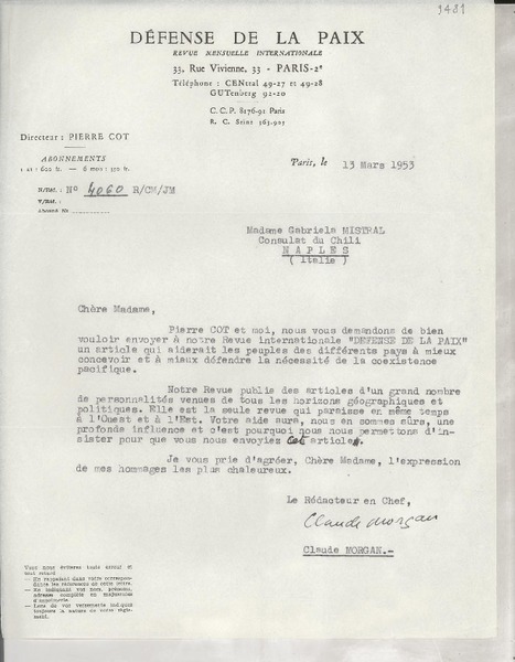 [Carta] 1940 mars 3, Paris, [Francia] [a] [Gabriela Mistral] [manuscrito] Francis [de Miomandre].