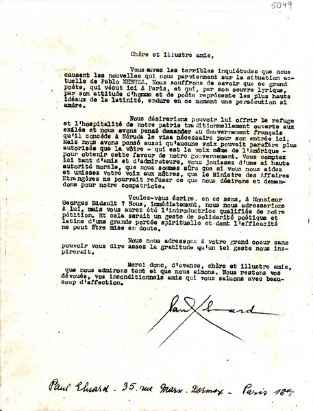 Correspondencia - Neruda, Pablo - Autores franceses - Manuscritos franceses - Poetas chilenos - Perroux, Francois