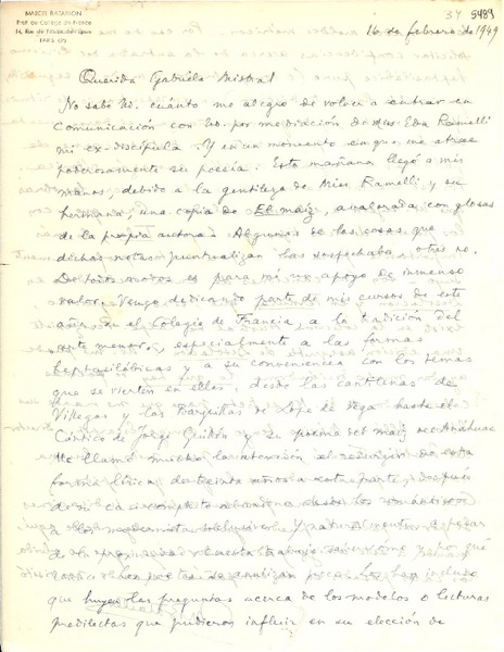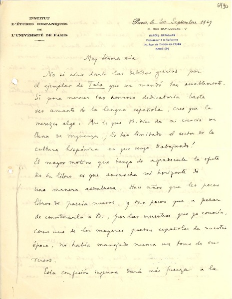 [Carta] 1939 sept. 30, Paris [a] Gabriela Mistral [manuscrito] Marcel Bataillon.