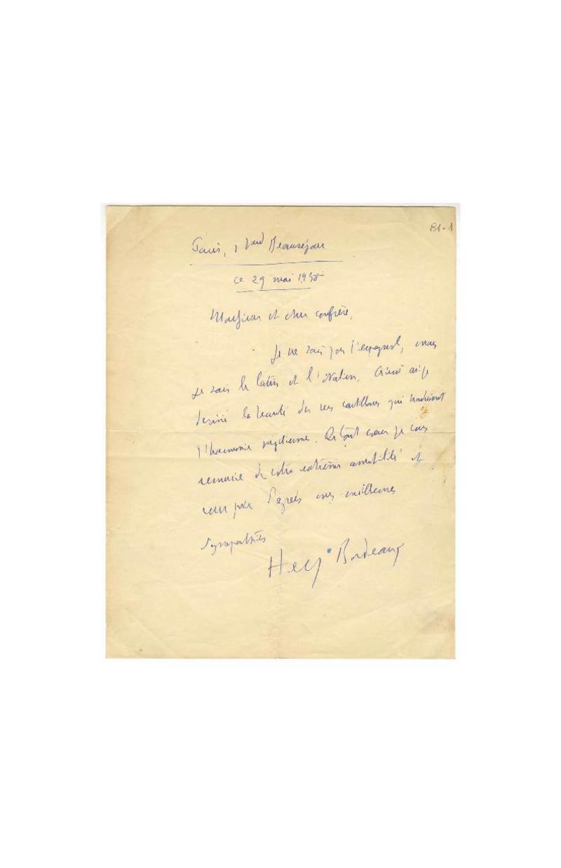 Paris, Francia [a] Salvador Reyes, Londres, Inglaterra Carta, 1951 octubre 1, [manuscrito] Blaise Cendrars.
