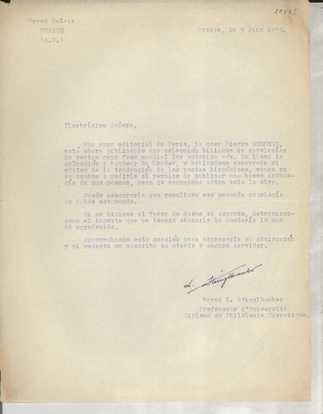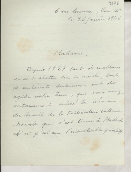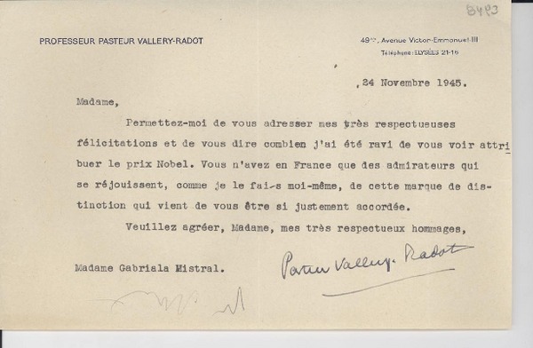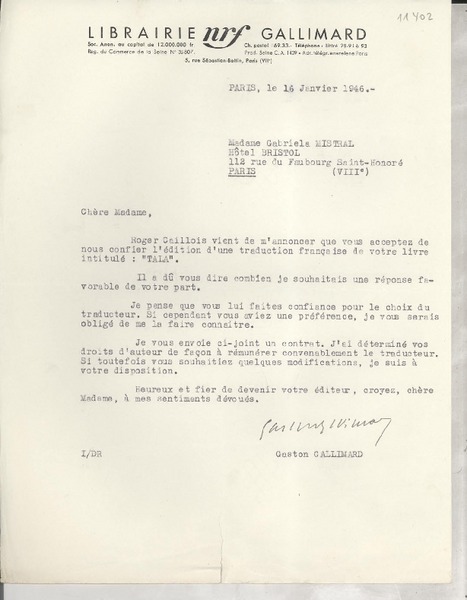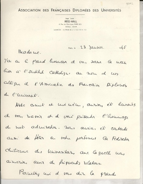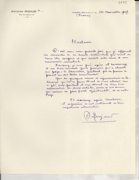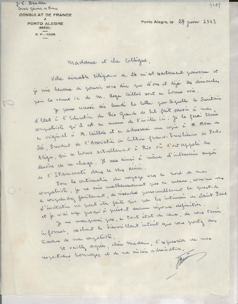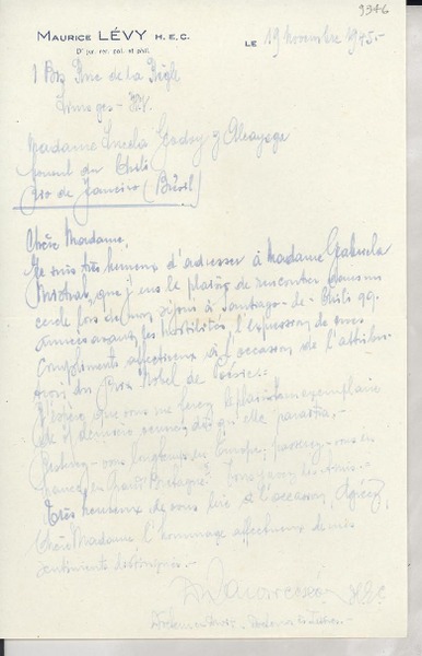 [Carta] 1934 déc. 11, Paris, 2 Rue de Montpensier, [France] [a la] Mademoiselle Gabriela Mistral, Consul du Chili, Madrid, [Espagne] [manuscrito] D. Braga, le Secrétaire général de la Collection Ibero-Américaine.