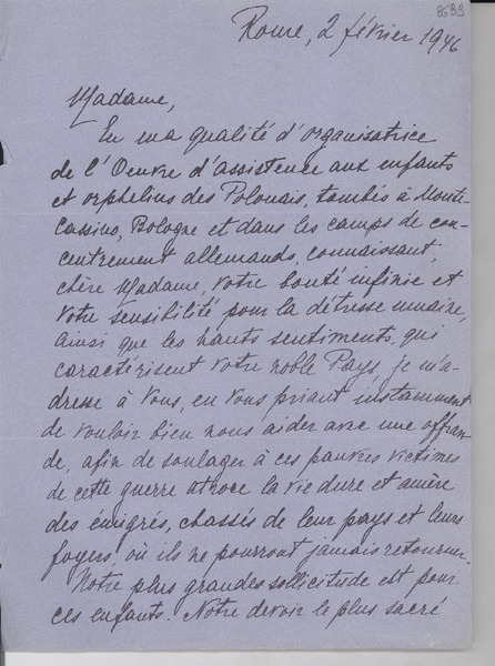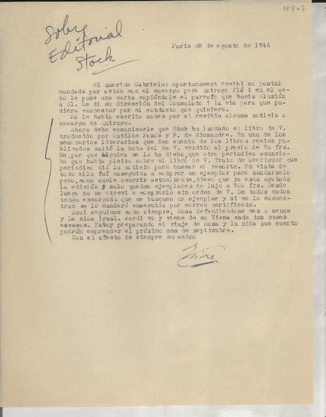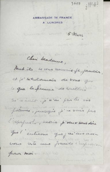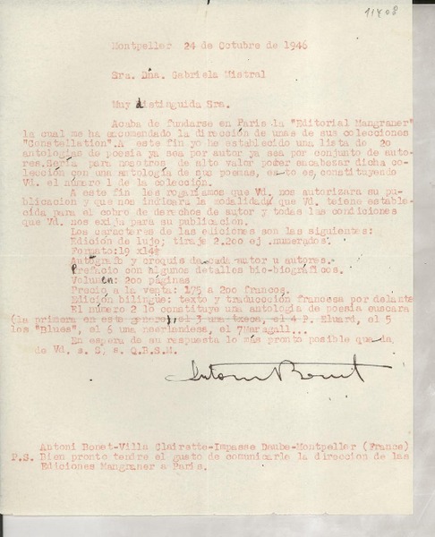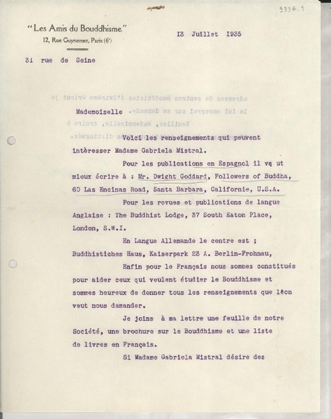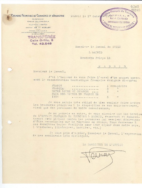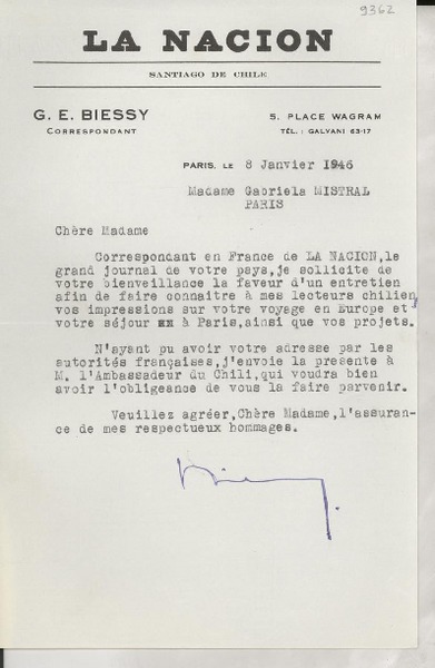 [Carta] 1934 août 1, Paris, Rue de Montpensier, [France] [a la] Mlle Gabriela Mistral, Consul du Chili, Madrid, [Espagna] [manuscrito] D. Braga, Le Secrétaire général de la Collection Ibero-Américaine.