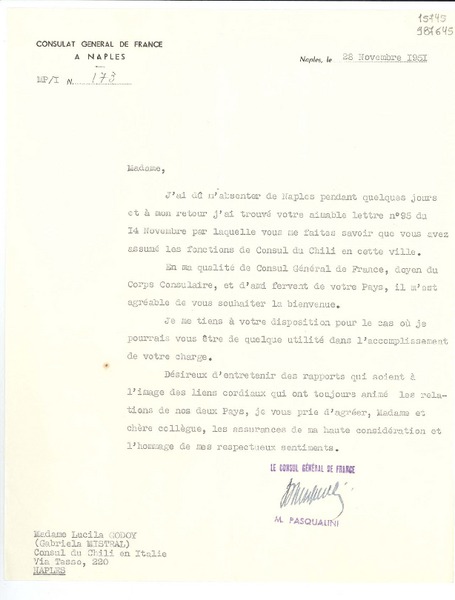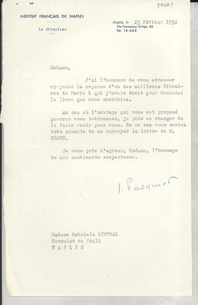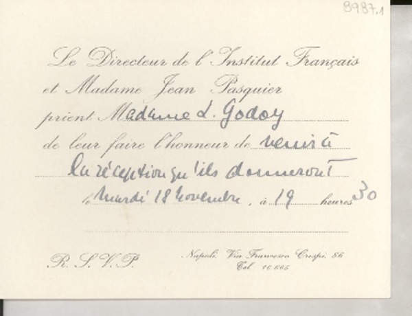 [Tarjeta] [1952?], Napoli, [Italia] [a] L. Godoy [manuscrito] Le Directeur de l'Institut Français, Jean Pasquier.