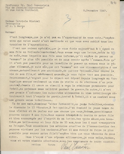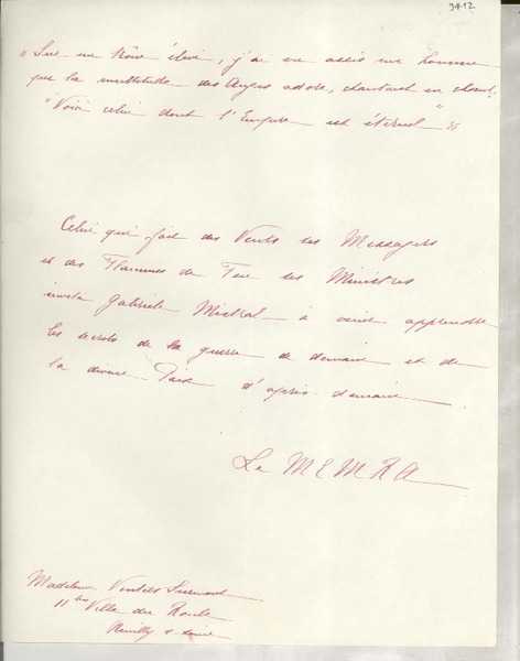 [Tarjeta postal] 1942, París, [Francia] [a] Gabriela Mistral, Petrópolis, Brasil [manuscrito] Raymond Lemire.