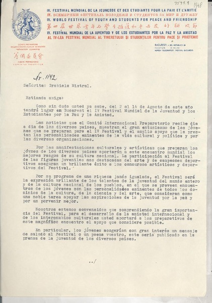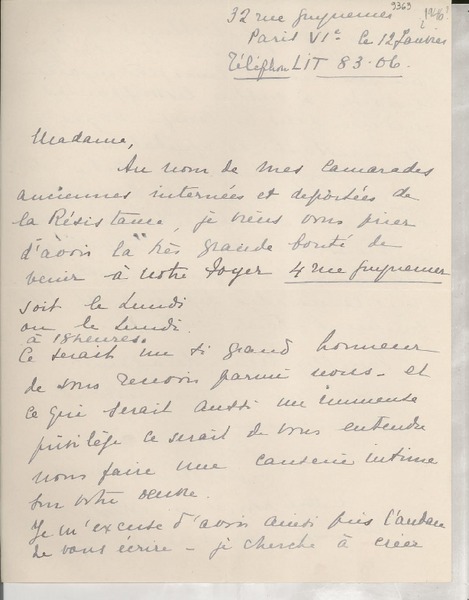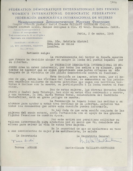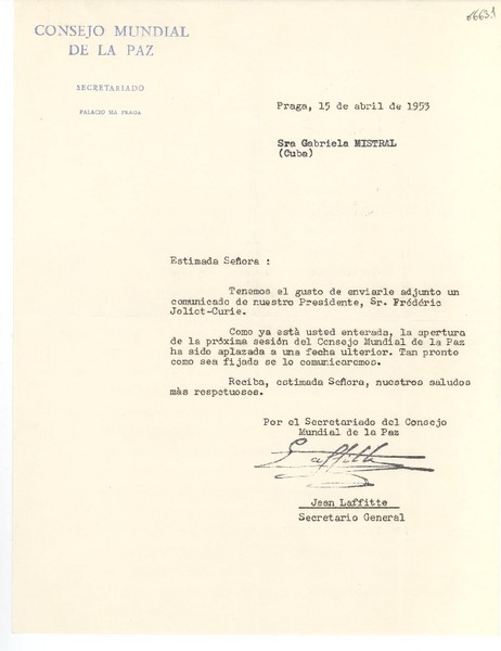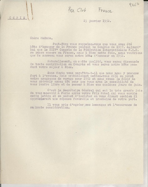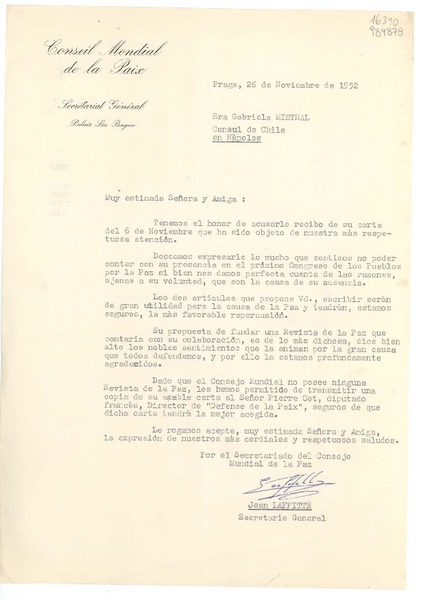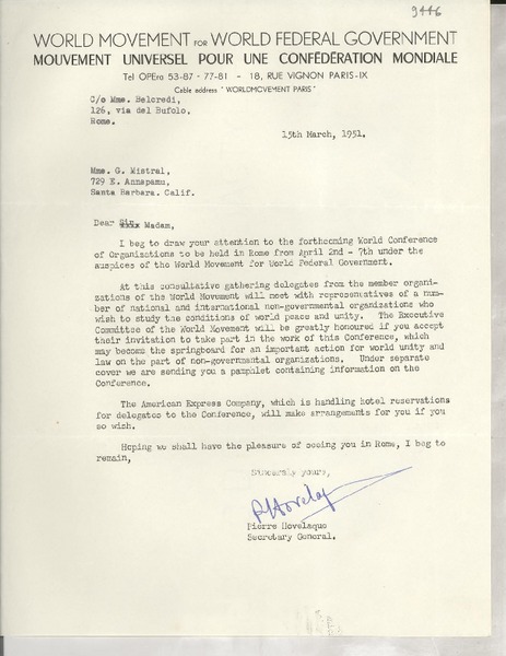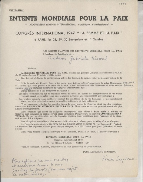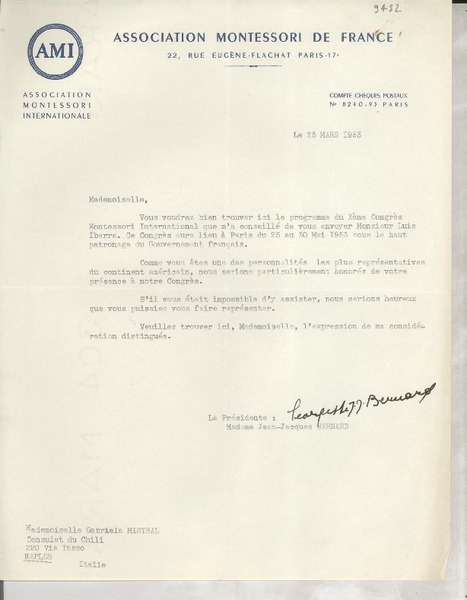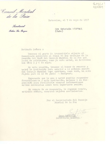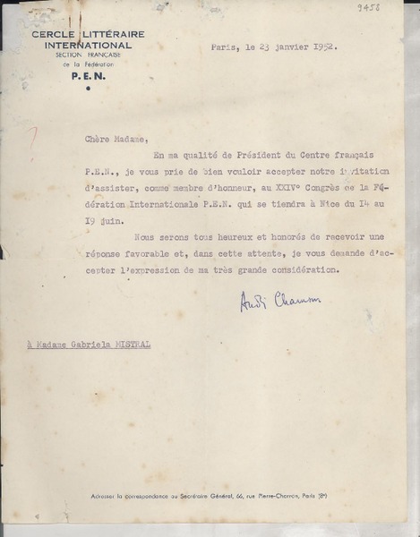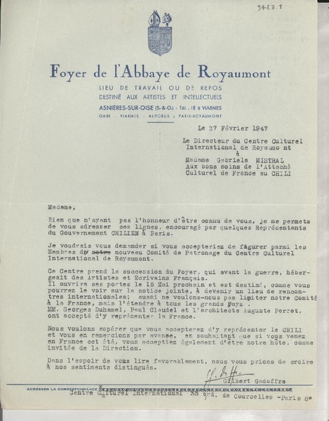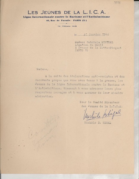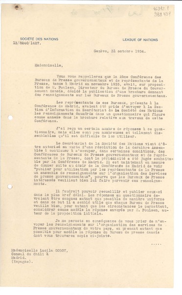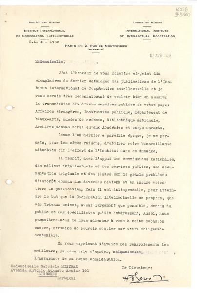 [Carta] 1933 oct. 28, Paris, [Francia] [a] Mademoiselle G. Mistral, Consul du Chili, Madrid [manuscrito] D. Braga, le secrétaire général.