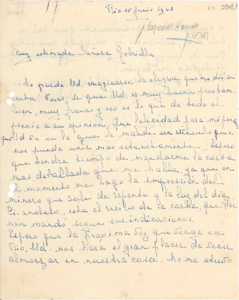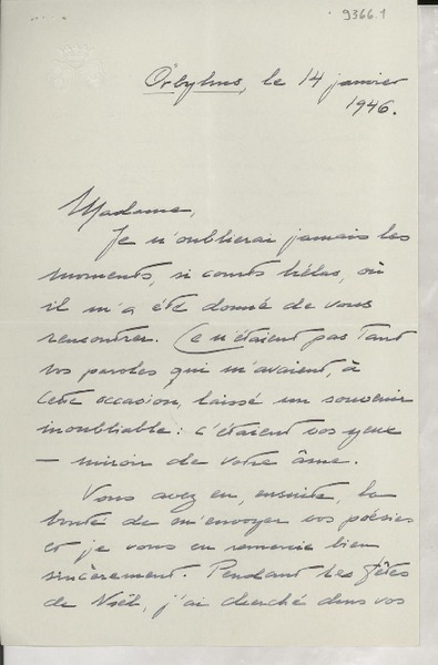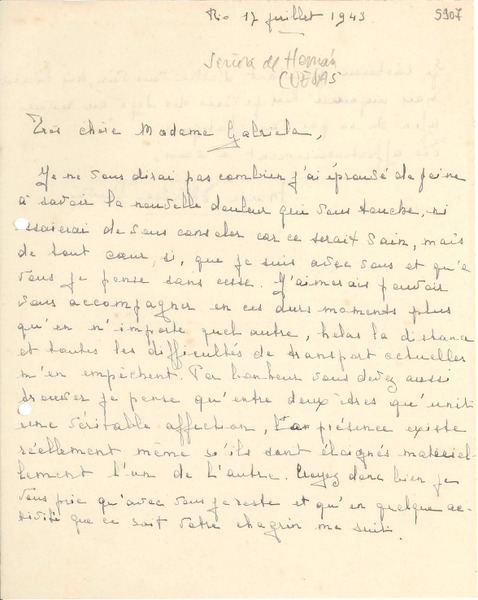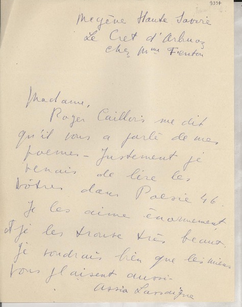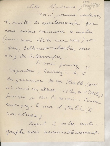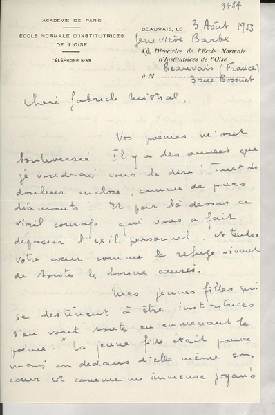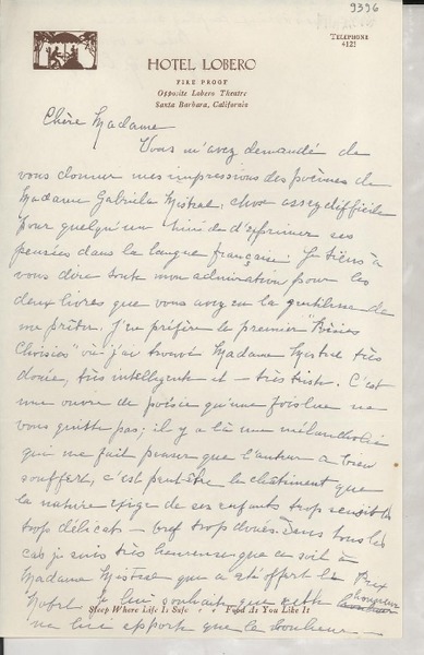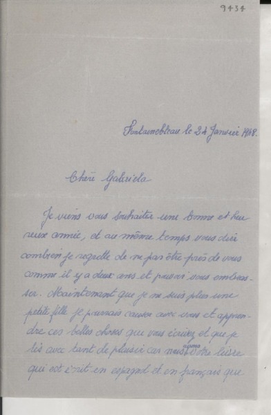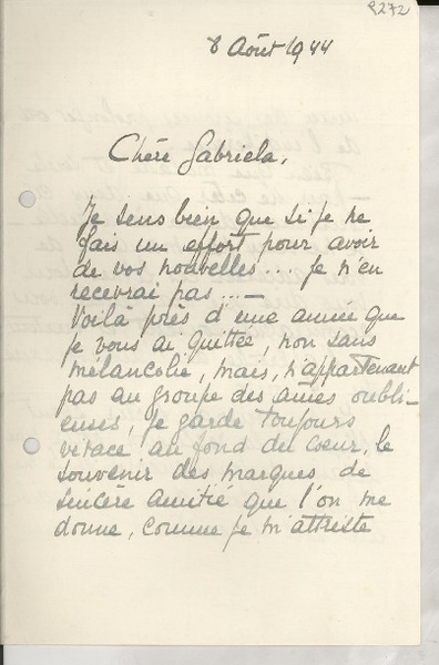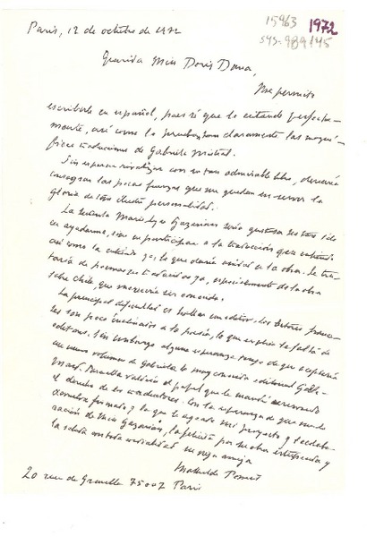 [Carta] 1932, Francia [a] Gabriela Mistral [manuscrito] Adrienne Pillaud.