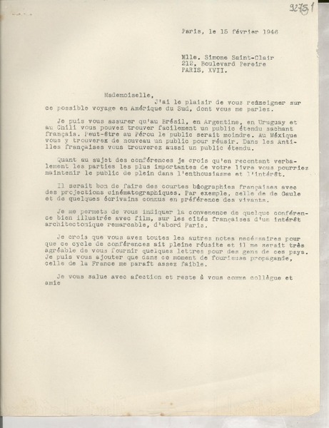 Saint-Cyr-Sur-Morin, Francia [a] Salvador Reyes Carta, 1946 febrero 2, [manuscrito] Pierre Mac Orlan.