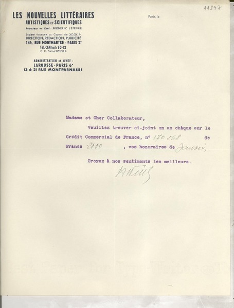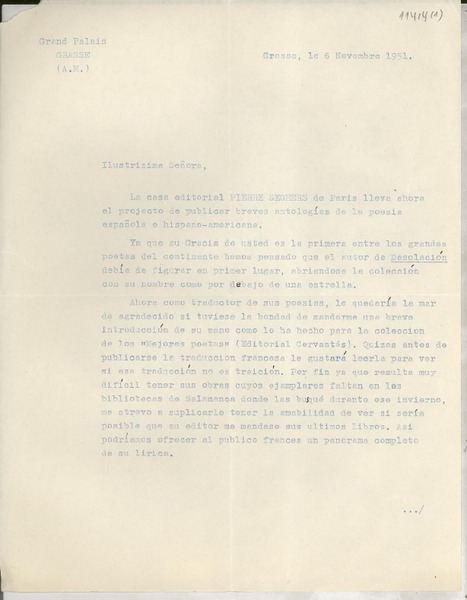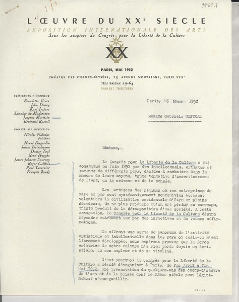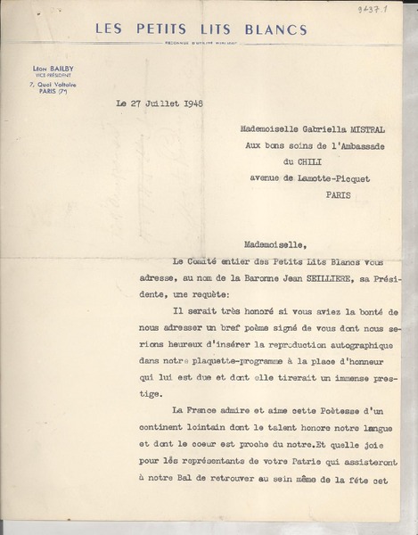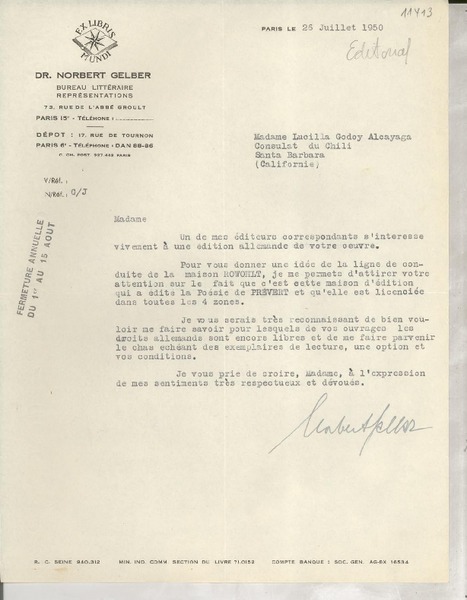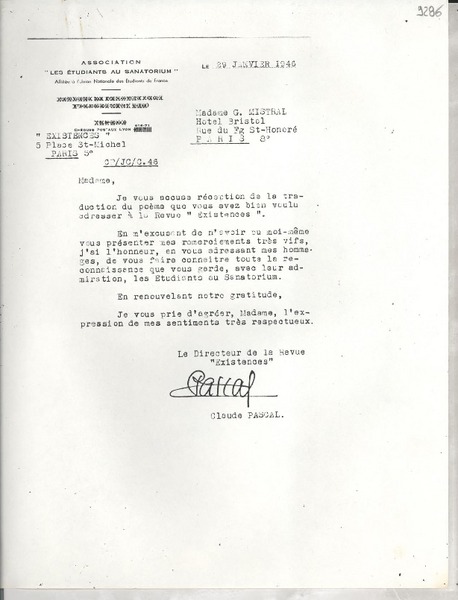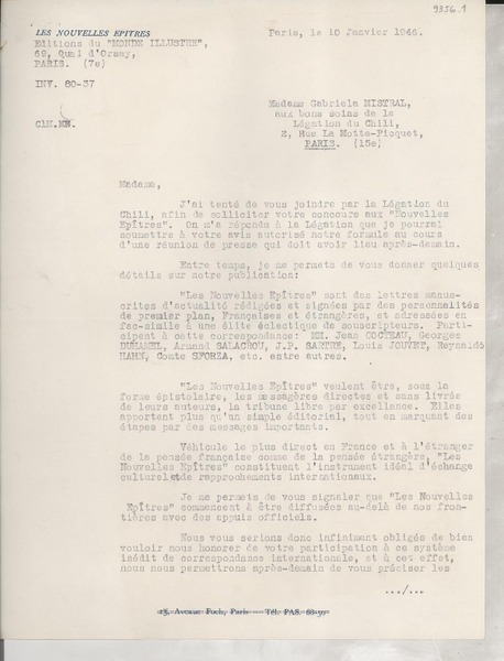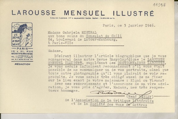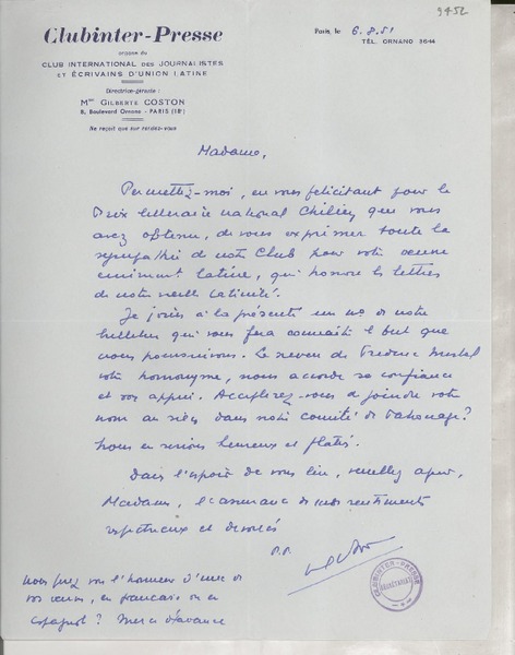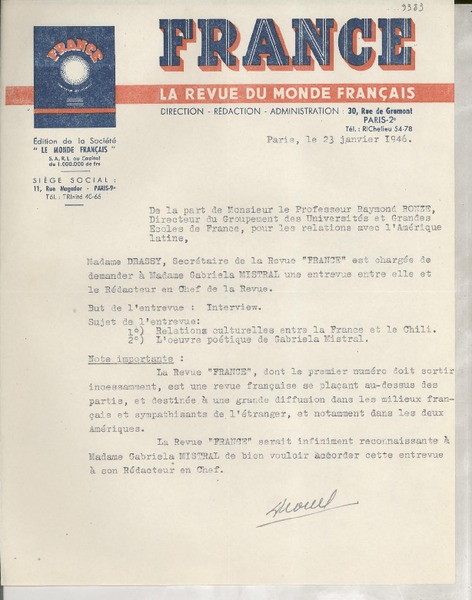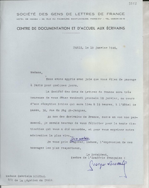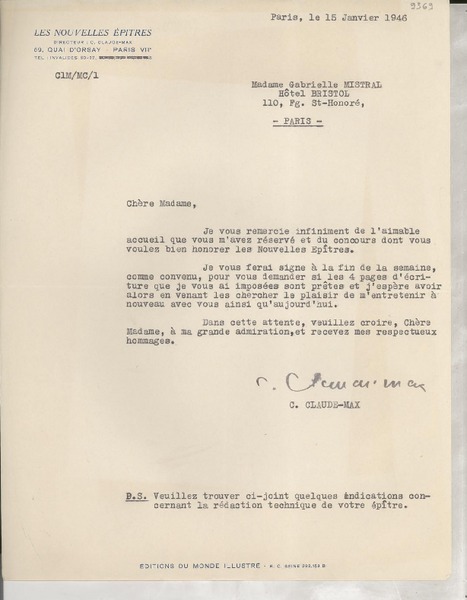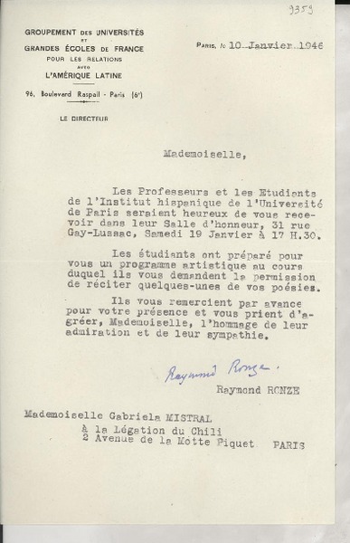 [Carta] 1925 oct. 13, Paris, [Francia] [a] Mademoiselle Gabriela Mistral [manuscrito] Le Directeur.
