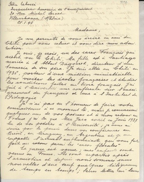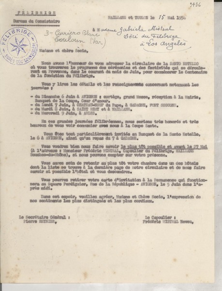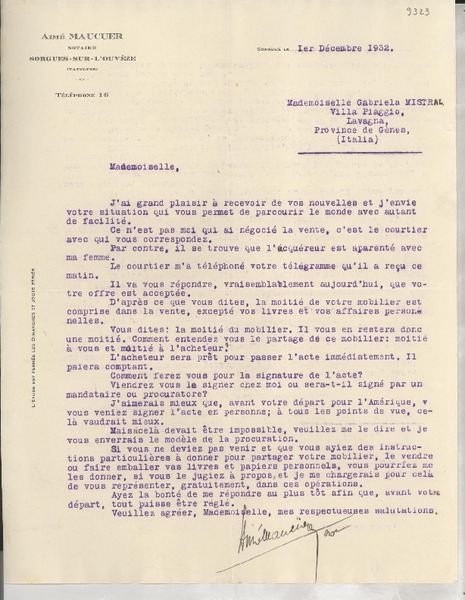 [Carta] 1932 déc. 1, Sorgues, [Francia] [a] Gabriela Mistral, Villa Piaggio, Lavagna, Italia [manuscrito] Aimé Maucuer.
