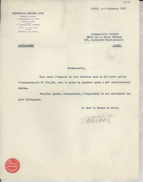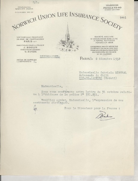 [Carta] 1927 dic 6, París, [Francia] [a] Gabriela Mistral, París [manuscrito] Jefe de la oficina de Norwich Union Life.