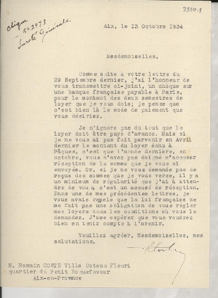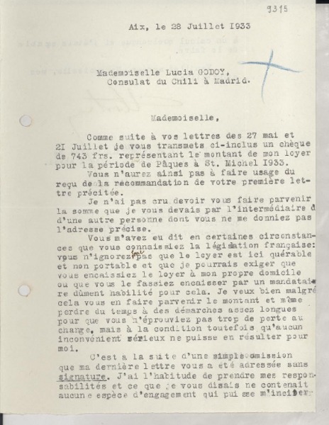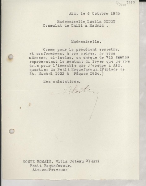 [Carta] 1933 oct. 6, Aix, [Francia] [a] Lucila Godoy, Madrid, [España] [manuscrito] De un arrendatario.