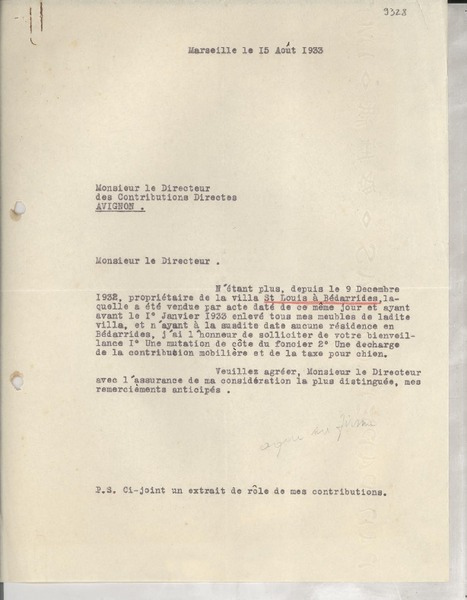[Carta] 1933 août 15, Marseille, [Francia] [a] le Directeur des Contributions Directes, Avignon, [Francia] [manuscrito] Del encargado de la venta de la villa St Louis à Bédarrides.
