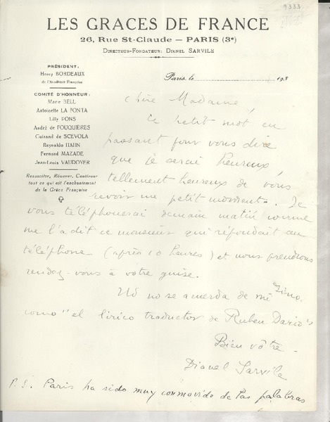 [Carta] 1915 enero 7, Paris, Francia [a] Rubén Darío [manuscrito] Paul Fort.