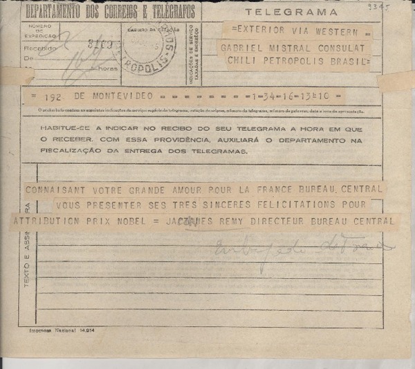 [Telegrama] 1945 mar. 8, Montevideo, [Uruguay] [a] Gabriel [i.e. Gabriela] Mistral, Petrópolis, Brasil [manuscrito] Jactaues [i.e. Jacques] Remy.