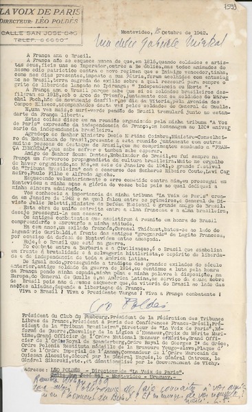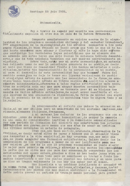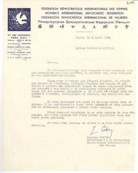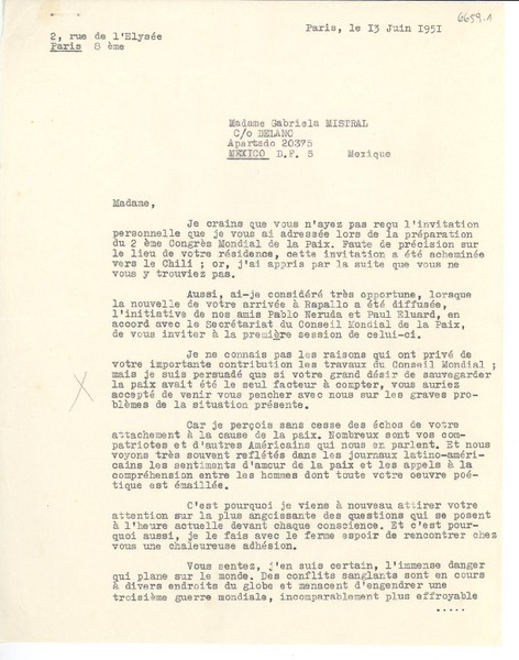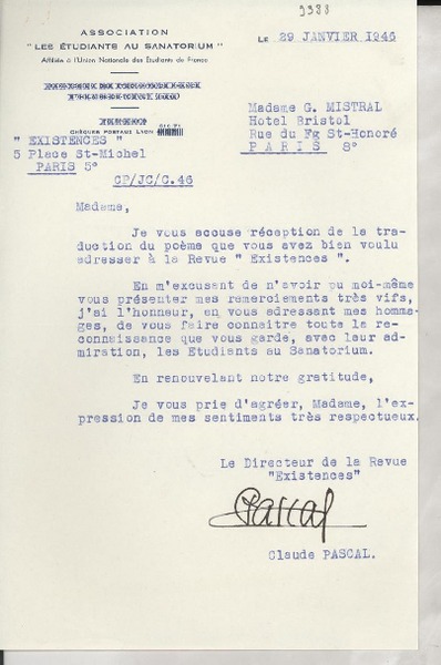 [Carta] 1933 juin 2, Paris, [Francia] [a] Mademoiselle G. Mistral [manuscrito] D. Braga, le secrétaire général.