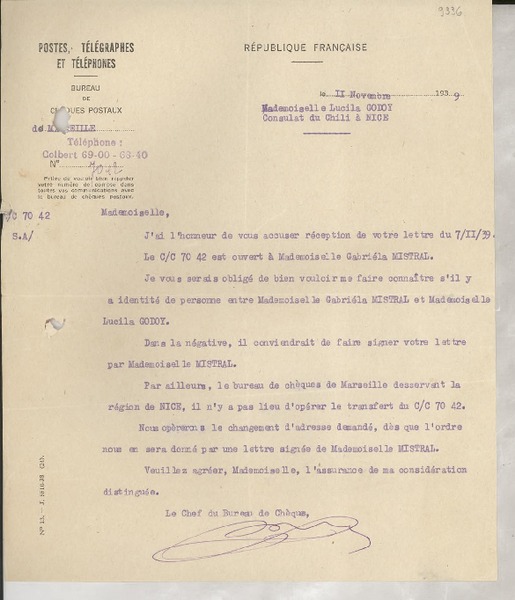 [Carta] 1932 dec. 10, Marsella, [Francia] [a] Lucila Godoy, Santurce, Puerto Rico [manuscrito] El Director.