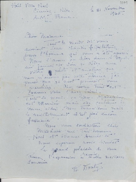 [Carta] 1933 nov. 14, Bedarrides, [Francia] [a] [Gabriela] Mistral [manuscrito] [Adrienne] Pillaud.