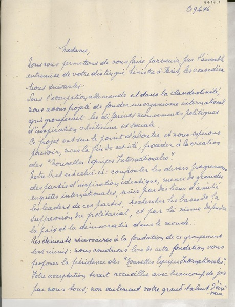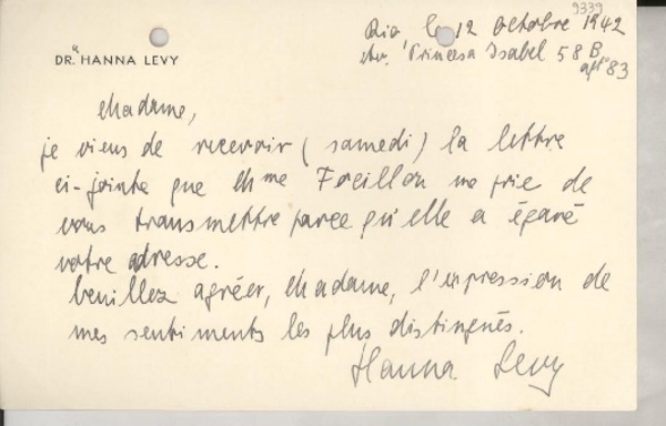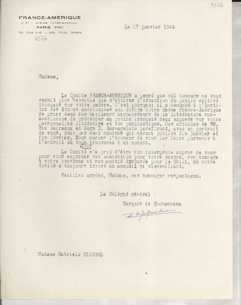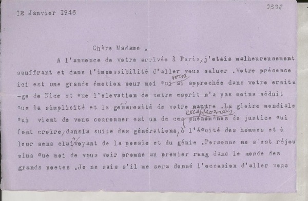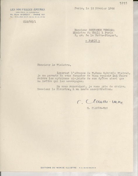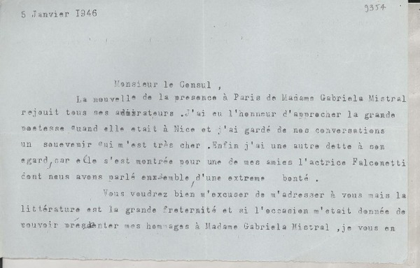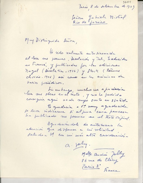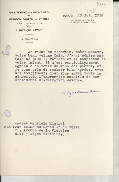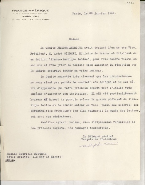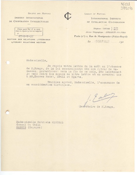 [Carta] 1933 sept. 9, Paris, [Francia] [a] Mademoiselle Gabriela Mistral, Consul du Chili, Madrid [manuscrito] Secrétaire de M. Braga.