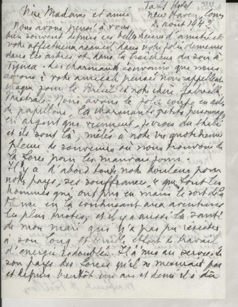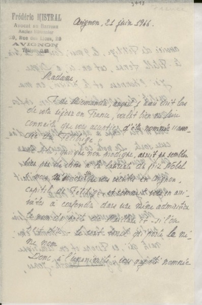 [Carta] 1933 juil. 3, Vedéne, France [a] Gabriella [i.e. Gabriela] Mistral [manuscrito] M. Marmottan.