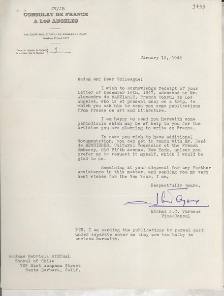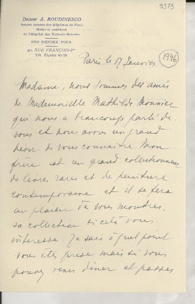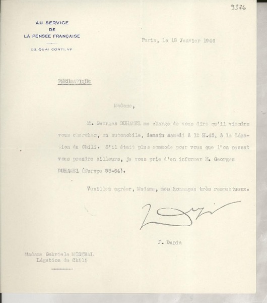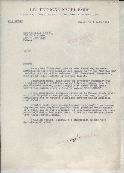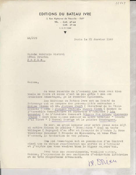 [Tarjeta postal] 1946 janv. 10, [Francia] [a] Gabriela Mistral, [Paris], [Francia] [manuscrito] Pierre Pages.